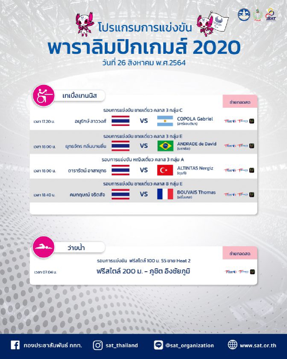 กองประชาส มพ นธ กกท ร วมเช ยร น กก ฬาพาราท มชาต ไทยช งช ย พาราล มป กเกมส โตเก ยว 2020 ท สปอร ต และ Ais Play ถ ายทอดสดให แฟนก ฬาร บชมแบบเต มอ มถ งบ าน การแข งข นก ฬาพาราล มป กเกมส โตเก ยว 2020 จะจ ดข นระหว างว นท 24 ส งหาคม 5 ก นยายน