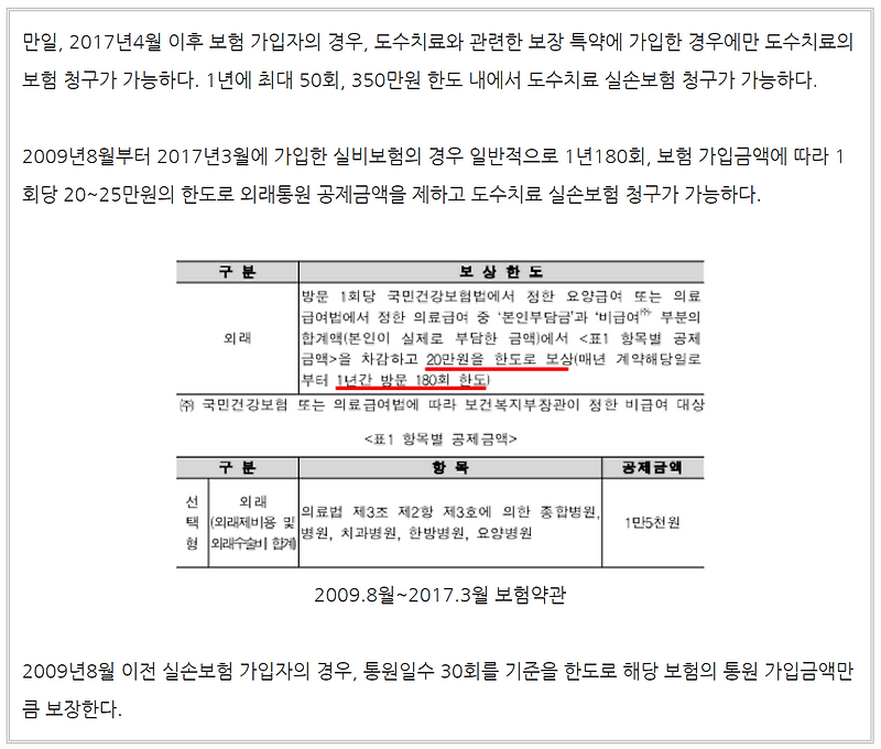 허리 디스크로 도수치료를 30일 일수 한도 중에서 12일만 써서 아직 18일의 치료 일수가 남은 상황이지만 365일 기간 한도를 모두 소진한 상황입니다. 2017년 4월 이후 가입한 보험의 경우 도수 치료는 연간 50회 연간 최대 350만원으로 치료 횟수와 비용이 제한되어 있습니다. 도수치료 실비 실손을 2009년 10월 이전에 가입했습니다면 1세대에 가입하신 겁니다.