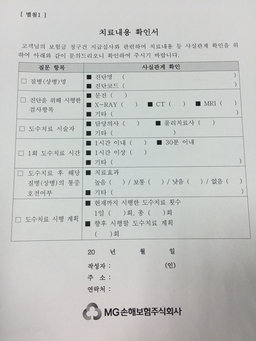 제가 다닌 병원은 통원확인서 처방전 진단서는 일부 발행이 불가능하거나 금액이 만원. 10만원을 기준으로 10만원 이하의 청구건이면 보험금 청구서와 처방전 약제비 영수증 진료비 영수증만 제출하면 됩니다만 10만원 이상일 경우 진단서 진료비 세부내역서 통원확인서 진료확인서 소견서 진료차트 등을 추가 증빙으로 제출 요구 받을 수 있습니다. 도수치료는 건강보험에서는 비급여지만 실손보험 가입자는 보험금을 청구할 수 있다는데서 문제가 시작됩니다.