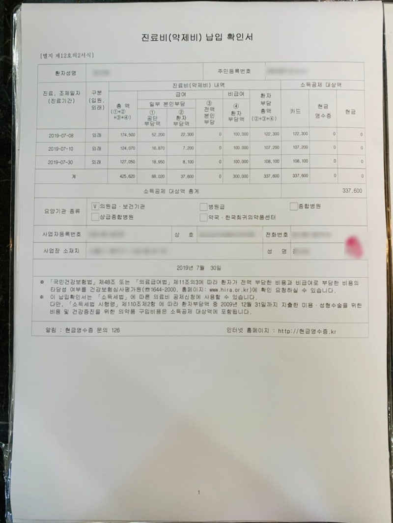 병원 발행 진료비 영수증 2. 이 도수치료의 실손보험과 관련해서. 도수치료 1회당 1만은 자기부담이고 나머지 금액은 실비보험.